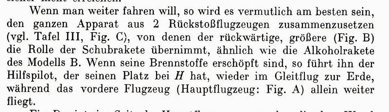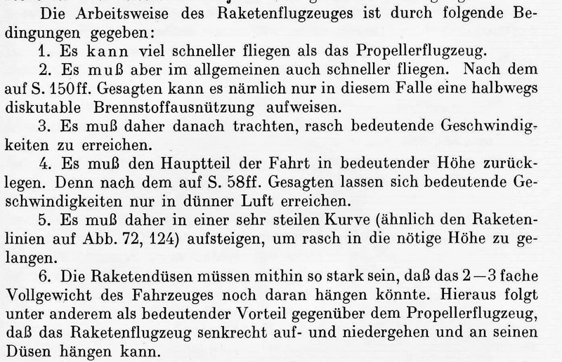 Hermann Oberth geht zu den beiden letzten Teilen in seinem Buch „Wege zur Raumschifffahrt“ 1929 sehr umfangreich auf die Raketenflugzeuge ein. Dabei geht es ihm vor allem um die Auseinandersetzung mit Max Valier.4 Er entwickelt aber auch eigenen Vorstellungen. Er schreibt zur Arbeitsweise von Raketenflugzeugen auf den Seiten 279 – 283 wie folgt: