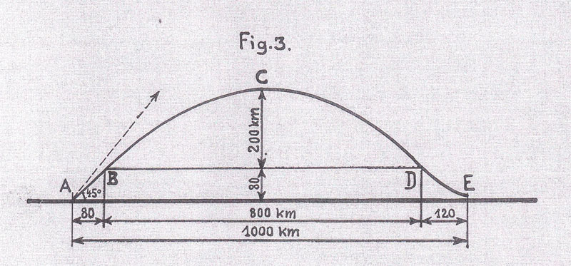 - Wenn sich das Raketenflugzeug auf der Erde bewährt hat, könne ein Weltraumschiff gebaut werden. Dafür wäre ein Hilfsflugzeug sinnvoll, welches das Weltraumschiff als Nutzlast emporträgt. Figur 2 zeigt einen solchen Flug, bei dem sich das Weltraumschiff im Punkt „C“ löst und das Hilfsflugzeug nach New York weiterfliegt.