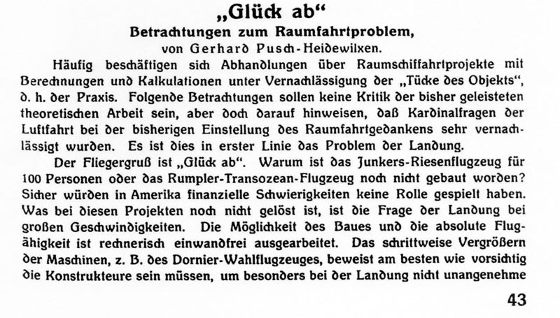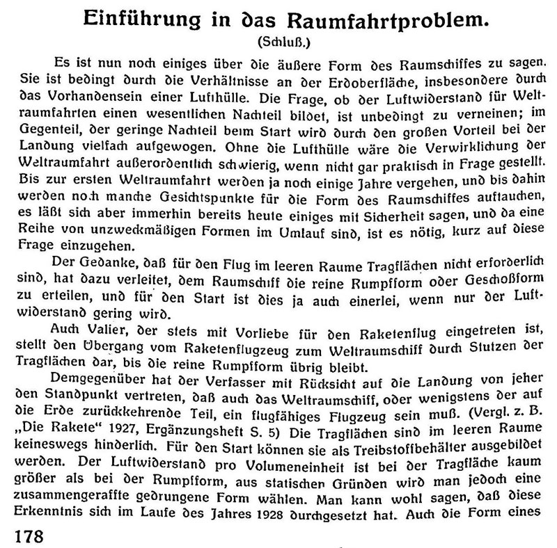 Der Abschlussteil der „Einführung in das Weltraumproblem“ von Johannes Winkler beginnt mit den folgenden Sätzen im Original: