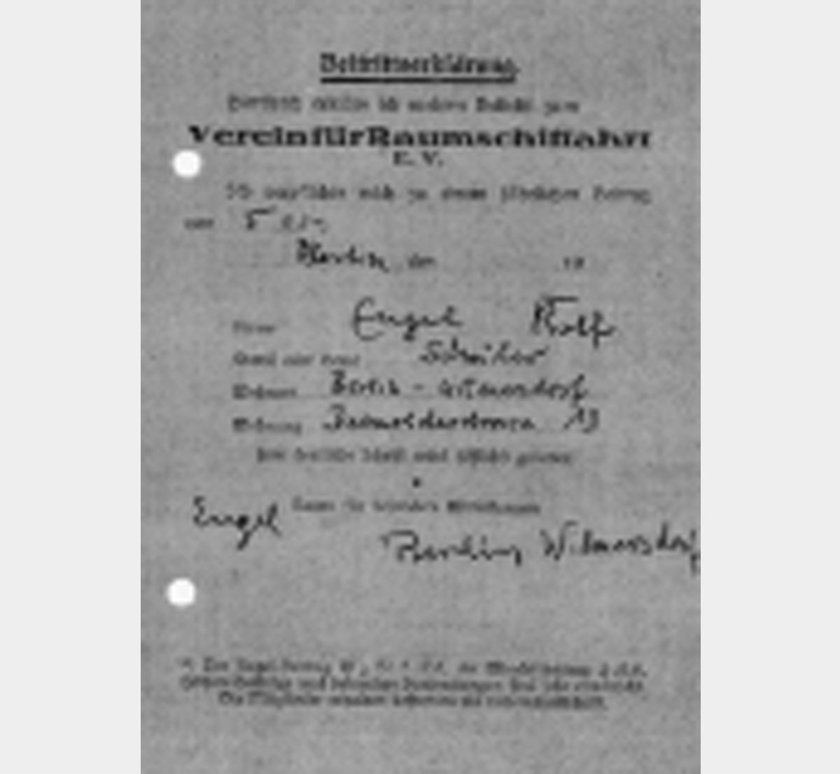 Rolf Engel trat im April 1931 in den VfR ein, als Johannes Winkler noch Mitglied des Vorstandes war. Das genaue Datum ist nicht bekannt, doch gibt es die nebenstehende Kopie seiner Beitrittserklärung.