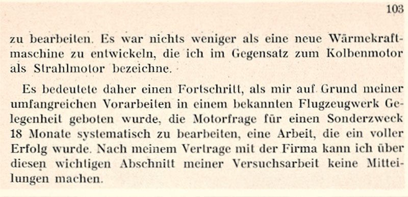 Mit Strahlmotorforschungen seit 1926 in Breslau, Dessau, Berlin, seit Herbst 1929 ausschl. mit der Entwicklung des Strahlmotors beschäftigt.