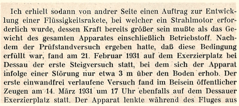 Anfang 1931 war der Strahlmotor soweit entwickelt, dass er zum Antrieb raketenartiger Flugkörper benutzt werden konnte. Der neue Motor lieferte bereits einen Rückstoß gleich dem doppelten Apparategewicht einschl. Betriebsstoff. Erster bezeugter Aufstieg am 14.3.31 in Dessau. Die Erfahrungen dienten als Konstruktionsgrundlage für einen neuen größeren Apparat, welcher extrem leicht gebaut ist u. etwa einen Zentner Startgewicht hat.